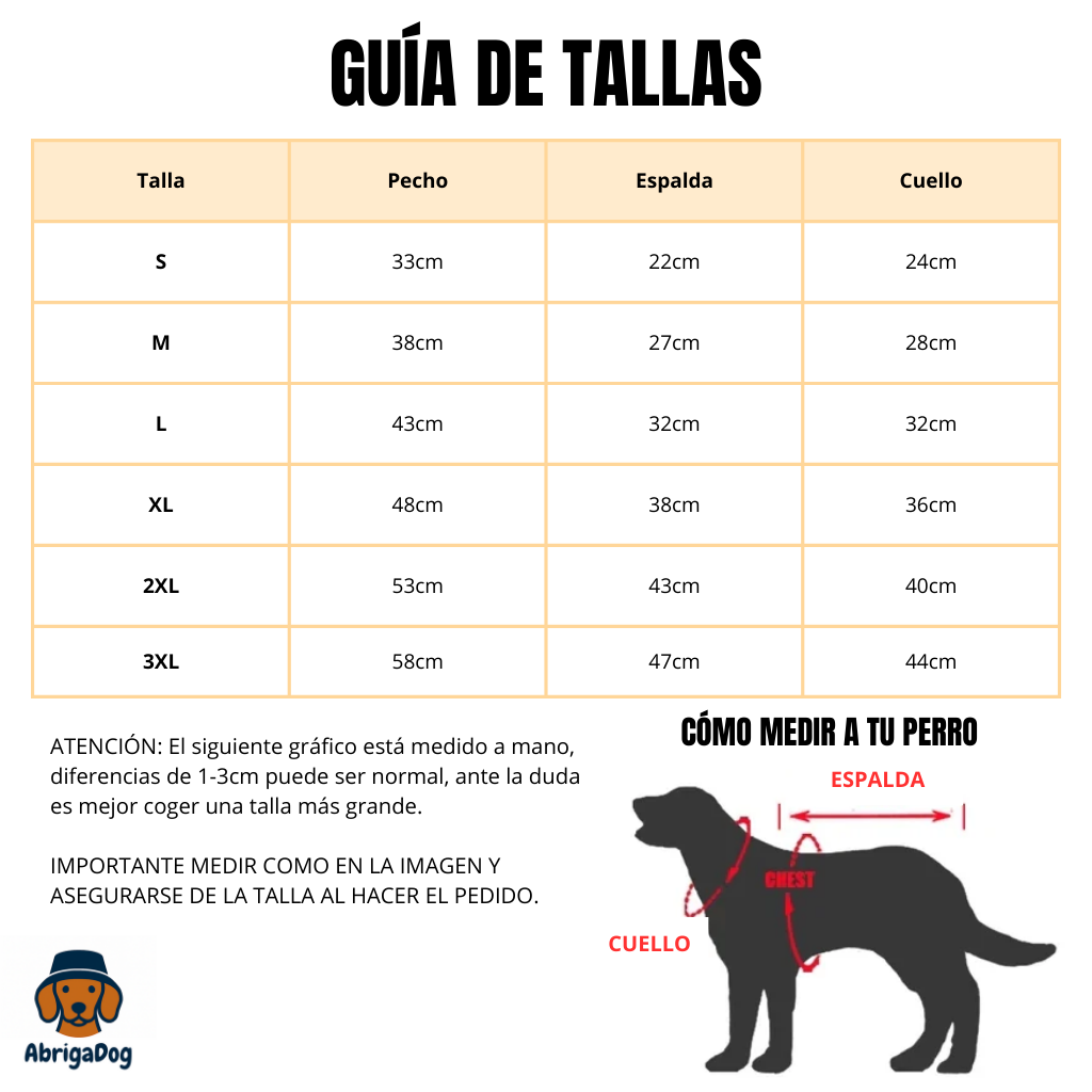 Solo necesitas medir el contorno del pecho y la longitud de la espalda de tu perro. En nuestra guía de tallas podrás encontrar la equivalencia exacta. Además para este chaquetón lo más importante es fijarse en la medida del pecho.
