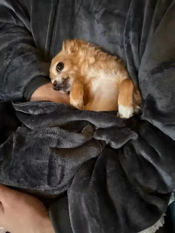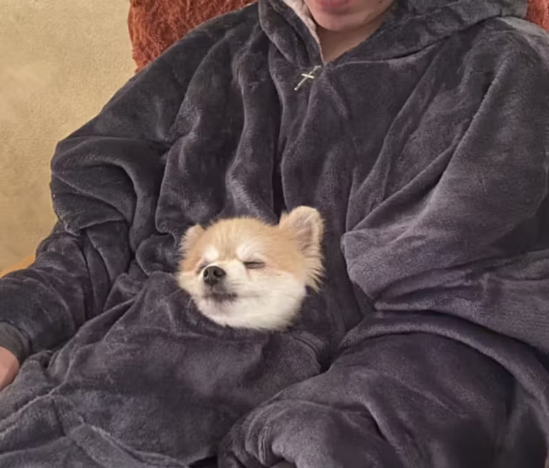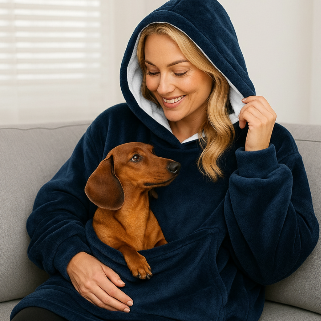 AbrigaDog™ te permite tener a tu mejor amigo cerca gracias a un cómodo bolsillo delantero integrado diseñado especialmente para ellos. Es suave, cálido y perfecto para esas mascotas que no conocen el espacio personal y quieren acurrucarse contigo.